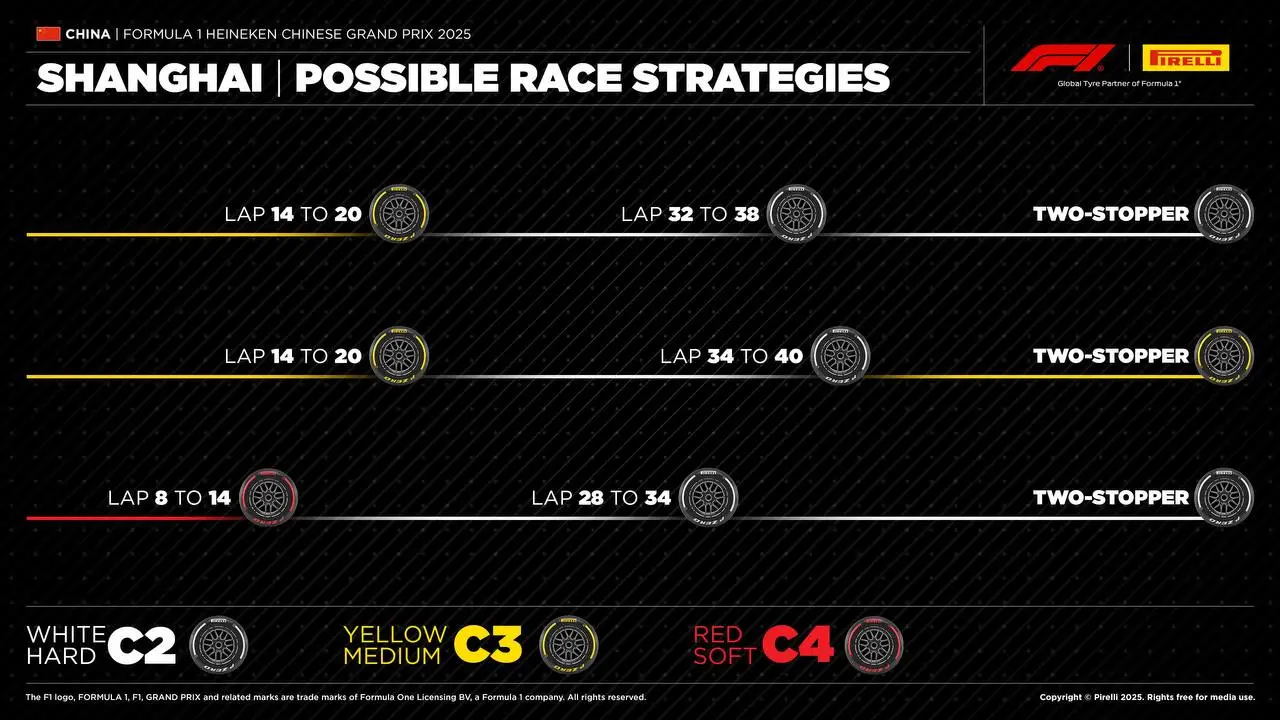 Pirelli indica come possibili strategie sempre le due soste con partenza su Media e poi passare alla Hard per lo stint centrale e concludere con un secondo treno di C2 oppure tornare alla C3, la gomma usata in partenza e nella Sprint Race. Esiste anche una possibile strategia che prevede la partenza sulla Soft, seppur comporterebbe un grosso rischio visto il degrado mostrato anche in Qualifica. Non è indicata, ma non da scartare, una partenza su gomma Hard per allungare il primo stint rispetto ai rivali; scelta che potrebbe essere fatta soprattutto da chi parte in posizione arretrata.