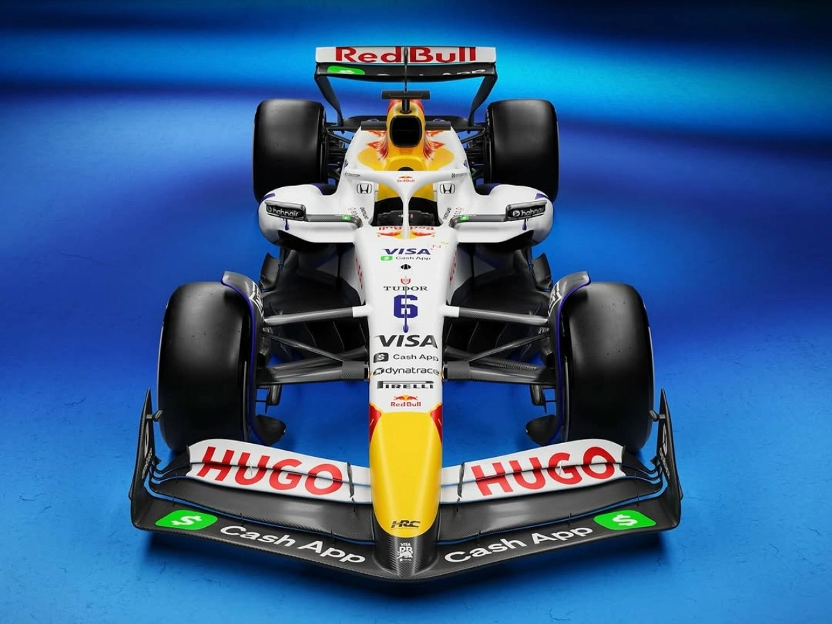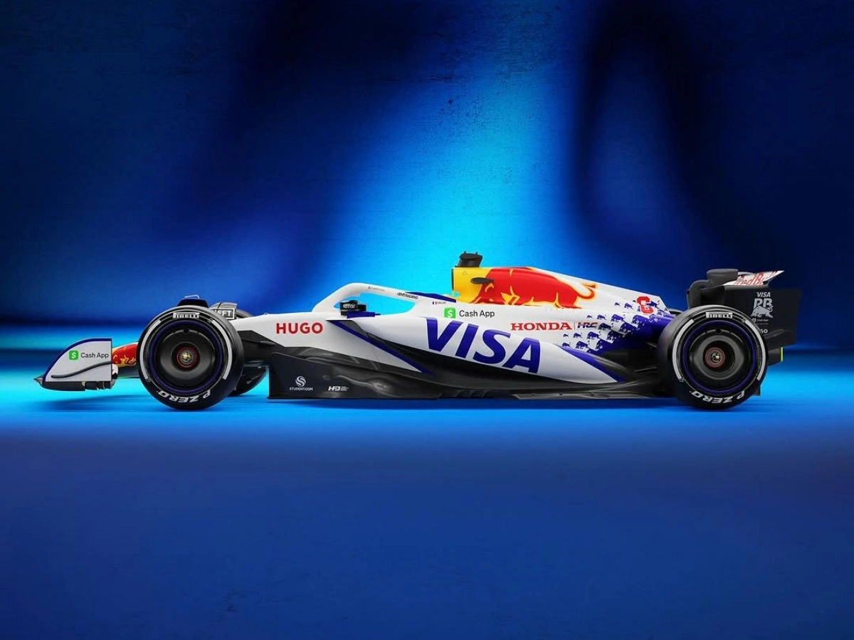Ecco i piloti della Racing Bulls: il confermato Yuki Tsunoda e il rookie Isack Hadjar. Il duo del team di Faenza sale sul palco con Laurent Mekies, il TP, e la nuova VCARB02. Il colore predominante è il bianco.