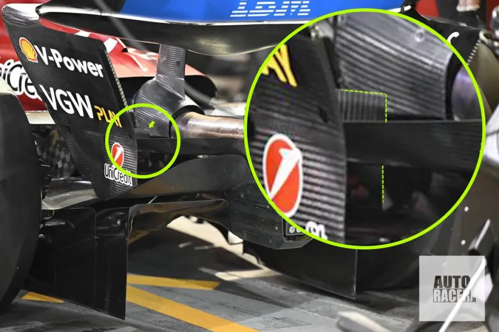 Nella zona del monopilone, dov’era attesa una modifica di contorno, è’ possibile scorgere una nuova appendice aerodinamica, posta alla base della struttura, ai lati dello scarico per intenderci, che andrà evidentemente ad influenzare l’aria calda in uscita dal cofano motore e quella condotta in basso dal vassoio ed indirizzate verso la parte alta del diffusore e la beam wing. Una modifica di affinamento rispetto ad un’aletta che in Ferrari avevano posizionato già lo scorso anno sul monopilone al GP di Australia.