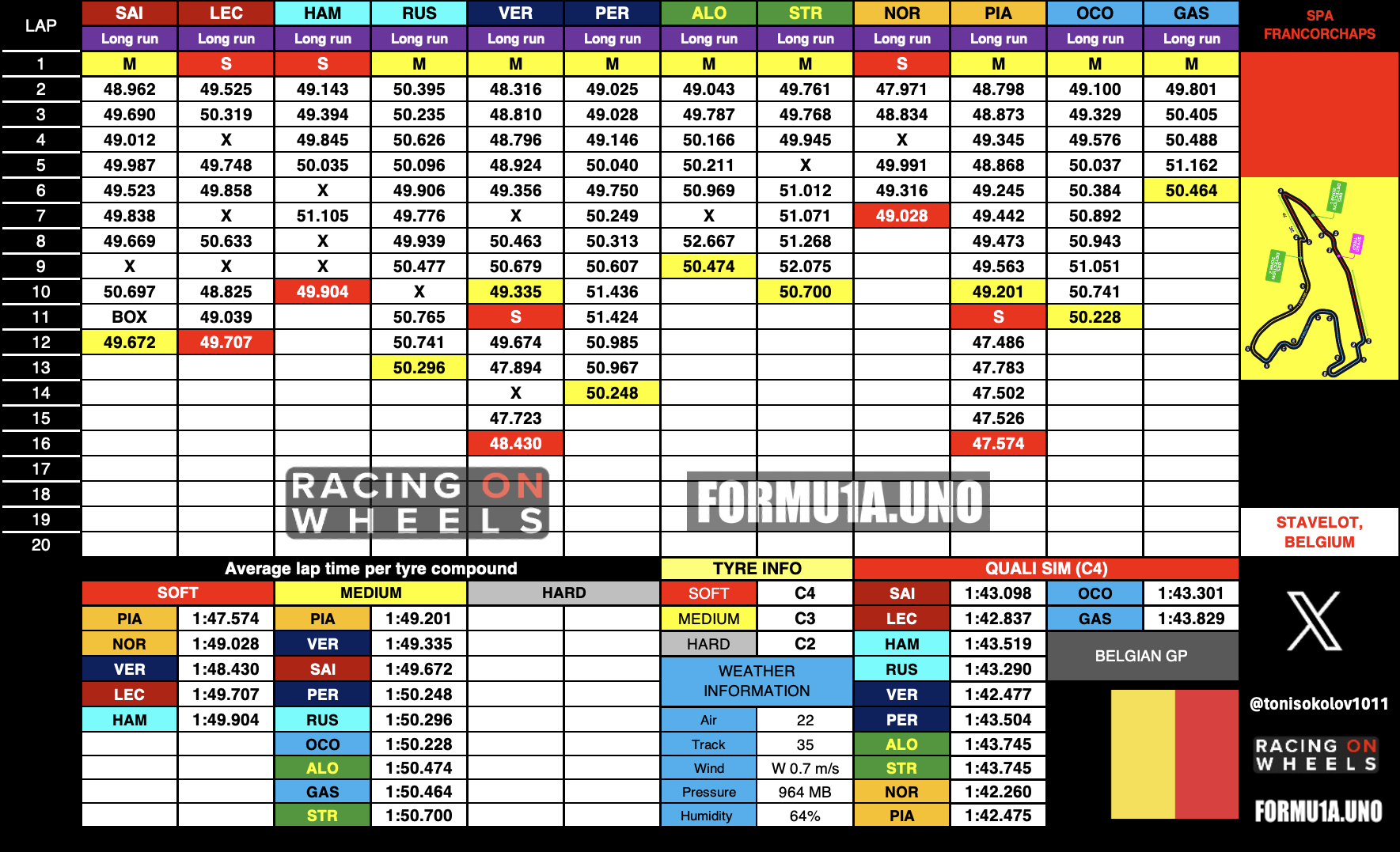 Il pilota più veloce del venerdì a Spa-Francorchamps è ancora Lando Norris, che sulla MCL38 ha rifilato ben due decimi al compagno di squadra e a Max Verstappen, risultato meno dominante rispetto alle FP1. La lotta però è ancora aperta e serrata: Oscar Piastri ha infatti dimostrato un passo gara molto competitivo, risultando più veloce dell’olandese che ha girato un po’ più scarico rispetto alla scorsa sessione. Ferrari sembra essersi avvicinata nel giro secco, ma perde diverso tempo nel terzo settore, costituito solo da un rettilineo a DRS chiuso e da una chicane. Simulazione di qualifica per Mercedes difficile da analizzare, ma Lewis Hamilton ha mostrato un passo gara costante nonostante la gomma soft.