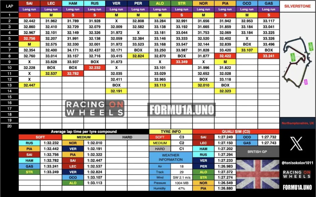 Dopo diversi giri su gomma rossa, Oscar Piastri e Carlos Sainz entrano ai box per montare la gomma media, dato l’enorme crollo dei tempi della C3. Dai long run si evince come la McLaren sia la macchina da battere, al netto dei carichi di carburante. Difficile da interpretare invece il lavoro della Red Bull, solita a nascondersi leggermente al venerdì. Ferrari e Mercedes sembrano giocarsela ancora come in Spagna e in Austria. A due minuti dal termine la pioggia si avventa sul tracciato e diversi piloti decidono di approfittare del momento per effettuare le prove di partenza su gomma intermedia.