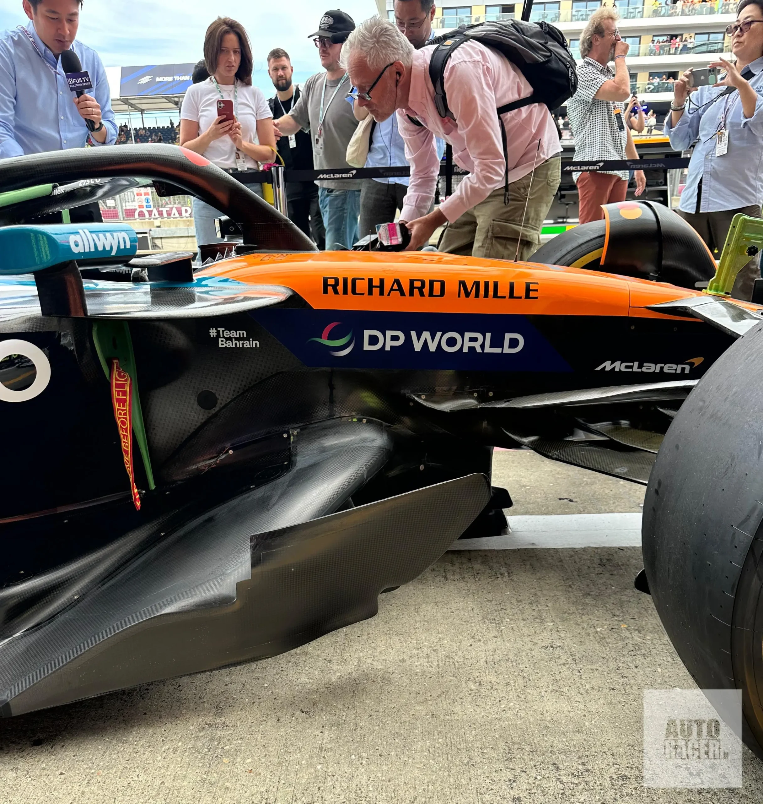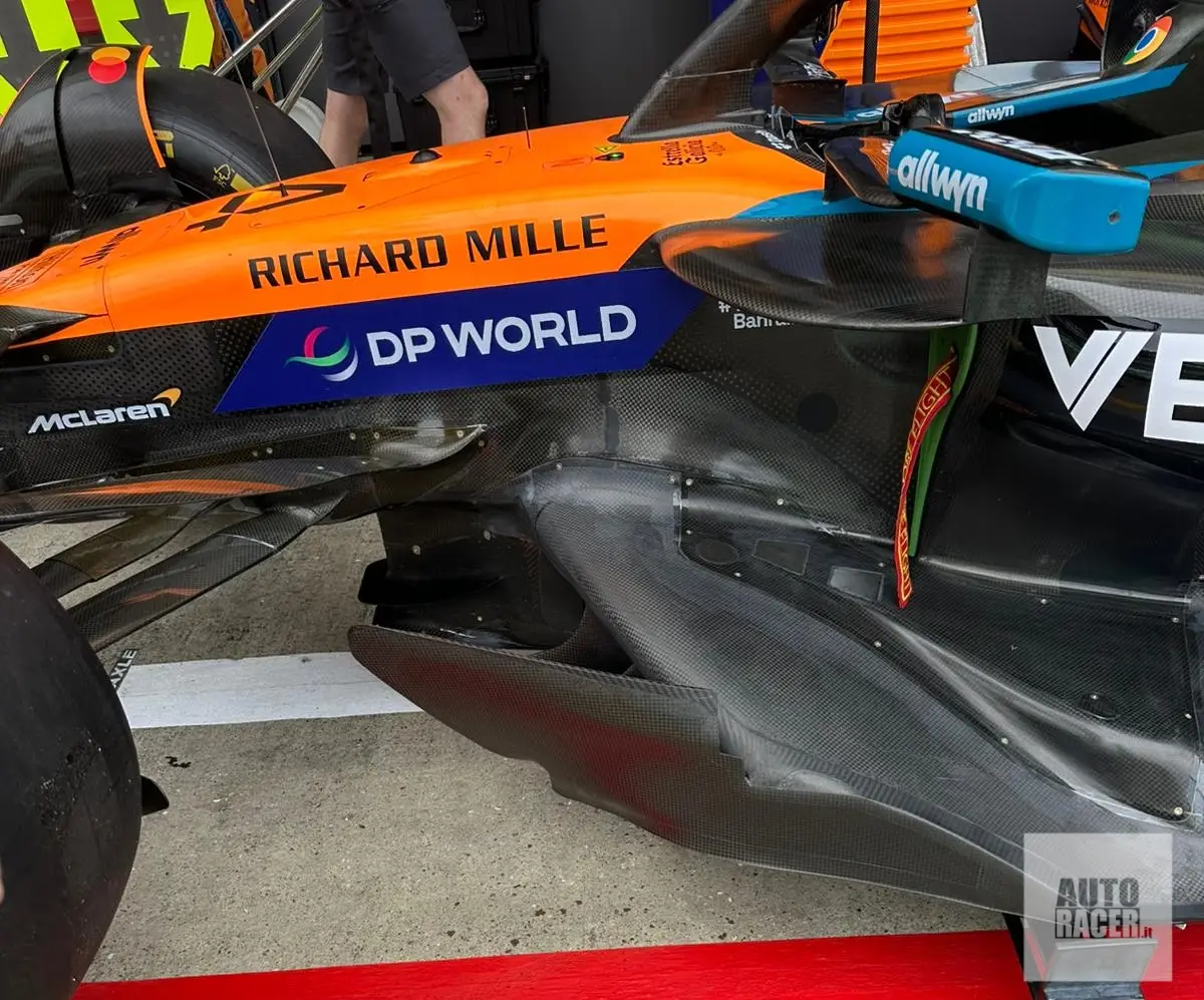 Sia McLaren che Red Bull hanno apportato alcune modifiche al fondo. Chiaramente, la struttura sottostante con i vari tunnel venturi non è possibile vederla, però anche esternamente è possibile identificare alcune modifiche, che danno un indizio sul lavoro svolto. Partendo da McLaren, la modifica più evidente è nella parte laterale del fondo, su quello che oramai è un mini estrattore laterale. E’ aumento il numero di generatori di vortice in quell’area. Il disegno si avvicina molto alla soluzione che è presenta sulla RB21. Lo scopo è energizzare l’uscita del flusso d’aria incanalato nei Canali Venturi ed anche produrre più carico locale, con la creazione appunto di vortici.