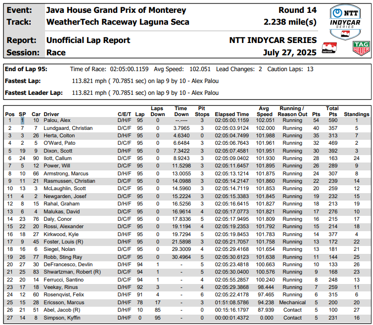 A Laguna Seca nessuno è stato in grado di fermare Alex Palou, che al termine dei 95 giri ha collezionato l’ottavo successo stagionale e il 19° della carriera IndyCar con una prestazione magistrale, ipotecando un quarto titolo che potrebbe arrivare già a Portland tra due settimane. Il 28enne spagnolo di Chip Ganassi Racing ha gestito senza alcuna difficoltà, imponendosi e staccando il gruppo nelle cinque ripartenze post-caution, unici momenti in cui Palou è stato avvicinato dalla concorrenza, senza mai prestare il fianco ai diretti avversari.