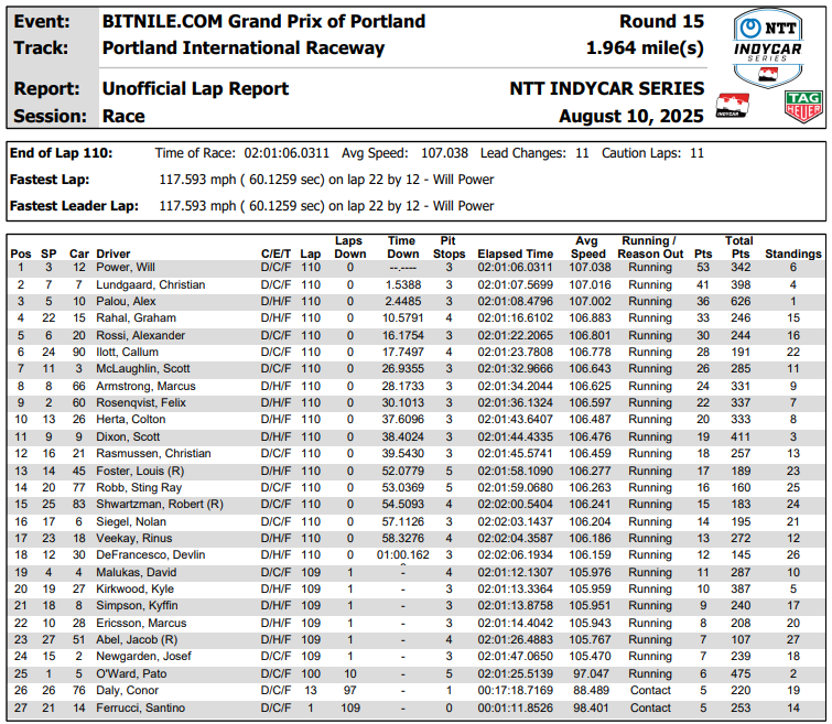 Con due gare d’anticipo sulla tabella di marcia Alex Palou conquista il quarto titolo della carriera in IndyCar al solo sesto anno d’attività, eguagliando Sebastien Bourdais, Dario Franchitti e Mario Andretti. Al 28enne spagnolo è bastato il terzo posto alle spalle del vincitore Will Power e di Christian Lundgaard per calare il poker, non senza lottare duramente per il secondo posto con lo stesso Lundgaard, bravo a difendersi nel finale della gara.
