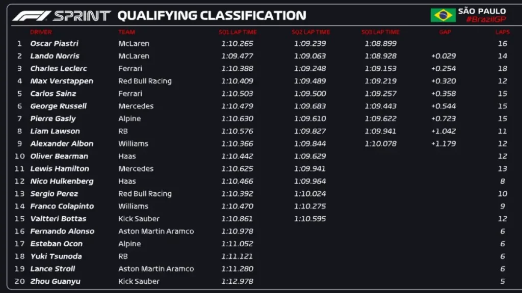 Oscar Piastri conquista per la prima volta a Interlagos la Sprint Pole in vista di sabato. Lando Norris completa la prima fila tutta arancione, e chissà se le Papaya Rules torneranno in auge nella Sprint. Gran giro di Charles Leclerc, davanti a Max Verstappen e Carlos Sainz. Deludono Lewis Hamilton e Sergio Perez, entrambi out in SQ2. Ottima sessione di Ollie Bearman e Liam Lawson, davanti ad entrambi i loro compagni. Molto bene anche Pierre Gasly e Alexander Albon, entrambi in top ten. Continua il periodo di crisi per Aston Martin che non porta nessuna vettura in top 15.