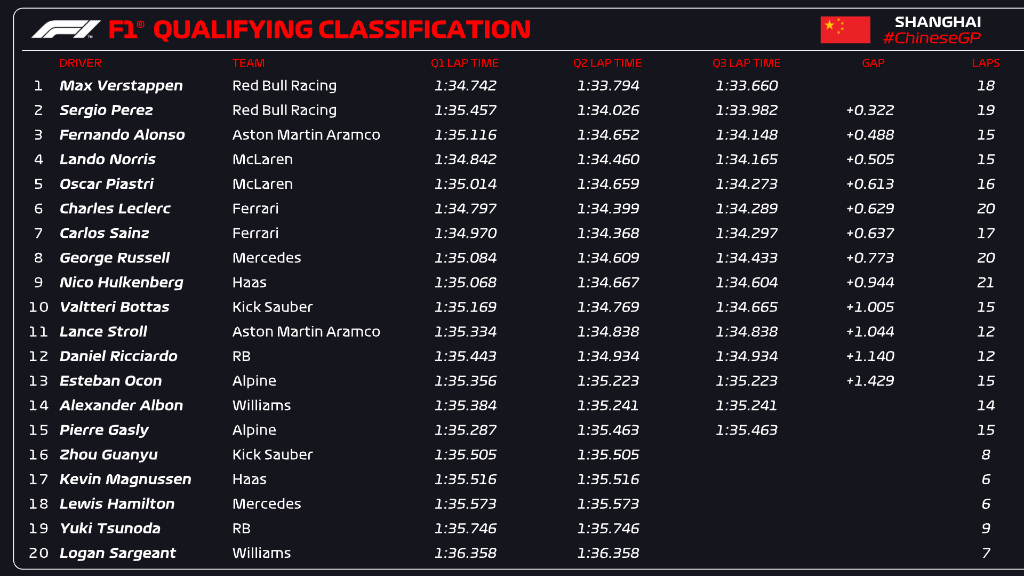 È la quinta pole consecutive quella siglata da Max Verstappen nel circuito di Shanghai che consegna a Red Bull la 100ima pole della loro storia. L’olandese ha iniziato a mostrate la propria superiorità già verso la fine del Q2, con il distacco dagli altri che aumentava giro dopo giro. La RB20 ha permesso ancora una volta di avere una finestra di funzionamento delle gomme molto più alta degli avversari, specialmente di Ferrari che fa ancora fatica a trovare il passo giusto. Ottimo Fernando Alonso, in terza posizione, che conferma le ottime prestazioni della AMR24 in Qualifica.