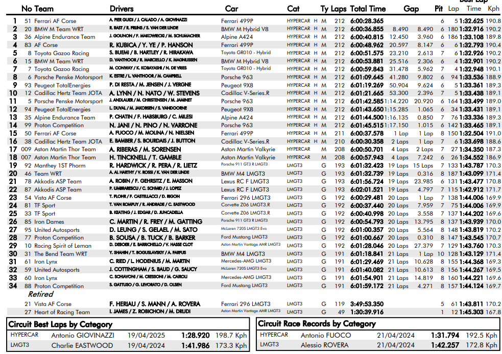 Primo podio di categoria per Lexus, in grado di artigliare il 3° posto con la RC F #78 di Robin/Gehrsitz/Masson, autori di una prestazione concreta. Sorrisi raddoppiati in Akkodis ASP, team al seguito del marchio giapponese, grazie alla 4^ posizione di Umbrarescu/Schmid/Lopez, arrivati davanti alla Ferrari AF Corse #54 appartenente a Flohr/Castellacci/Rigon, impegnati in dure battaglie nell’arco dell’intera gara. Danni limitati, invece, per la Corvette #33 di TF Sport che, nonostante i 36 kg di zavorra dovuti al Success Handicap, ha comunque portato a casa ottimi punti con il settimo posto, precedendo peraltro la Porsche delle Iron Dames.