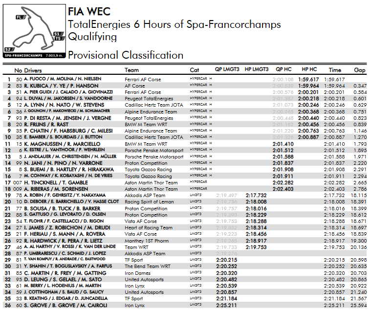 Peugeot, Cadillac e Alpine hanno provato nell’ordine a spezzare la tripletta Ferrari, avvicinandosi sotto il profilo cronometrico alla #51 di Giovinazzi, autore di un’uscita di pista a Les Combes, senza però avere la meglio. Ottimo quarto posto, comunque, per Peugeot con la #94 affidata al pilota di casa Stoffel Vandoorne, seguito dalla Cadillac-Jota #12 di Alex Lynn e dalla Alpine #36 di Mick Schumacher, tutti racchiusi nel fazzoletto di un decimo. Poco più staccata l’altra 9X8, la #93 di un Jean-Eric Vergne che, almeno in qualifica, dimostra che la Hypercar francese possa dire finalmente la sua su un asfalto più liscio del passato.