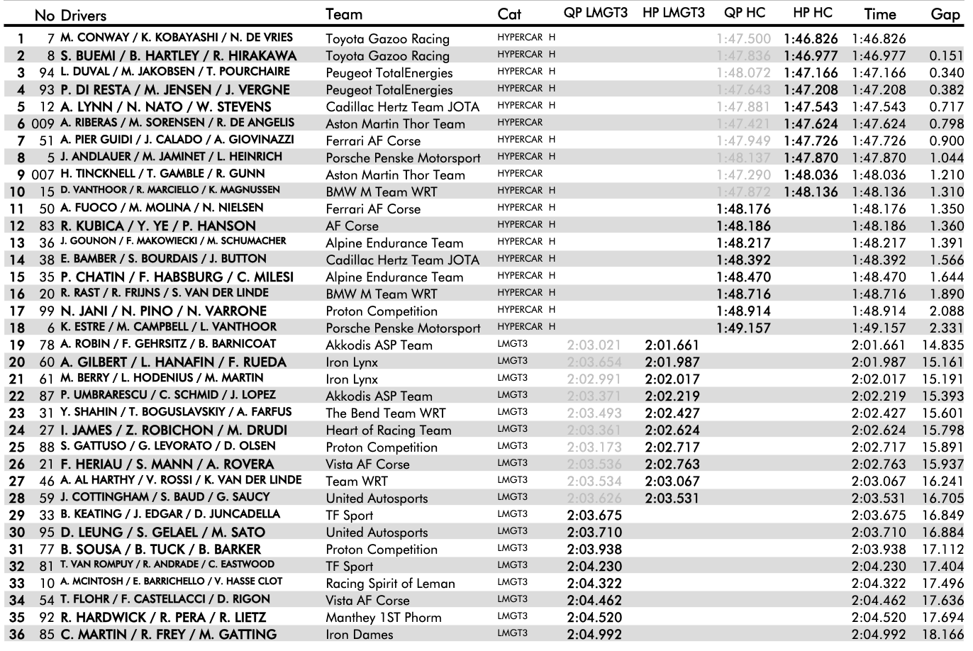 Il pacchetto tecnico Toyota Gazoo Racing, di per sé adatto alla pista e per l’occasione libero di qualche kg, ha dato a Kobayashi e Hartley gli strumenti giusti per prevalere nelle ultime qualifiche dell’anno e della GR010 attuale, pronta a cedere il passo alla versione evo. Le Hypercar giapponesi hanno regolato entrambe le Peugeot, al terzo e quarto posto con Malthe Jakobsen e Jean-Eric Vergne, dopo i quali i ritardi aumentano nettamente. Le 9X8 hanno contenuto il distacco entro i quattro decimi, lievitati a ben sette passando al quinto posto, artigliato da Alex Lynn sulla Cadillac Jota #12, obbligata a vincere e sperare nel miracolo sportivo per portare a casa il titolo piloti. Nella prima sessione Aston Martin ed il team THOR hanno dato ottimi segnali stampando il primo e secondo tempo, ma nella Hyperpole Sorensen (6°) e Gunn (9°) non sono riusciti a ripetere i tempi.